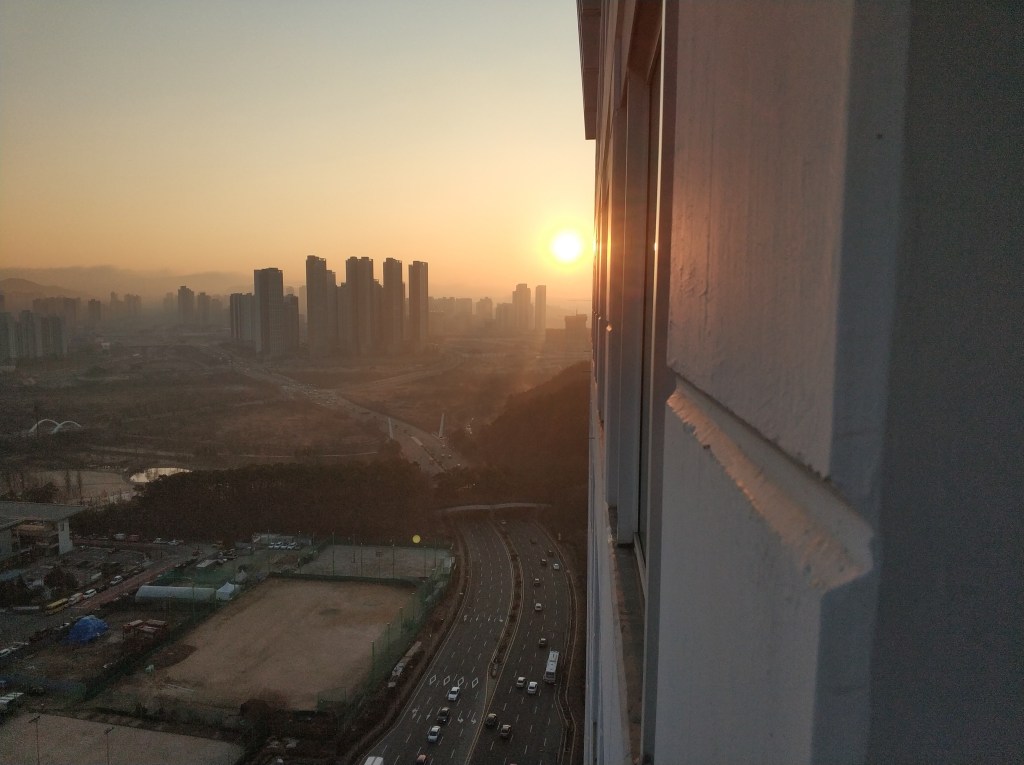 מה גם שקוריאה היא מדינה מודרנית ומתקדמת, ושלא כמו מדינות מזרח תיכוניות מפגרות שלא נזכיר את שמן אבל הוא מתחיל בי' ונגמר ב'שראל', אין פה את הקונספט המטופש של שעון חורף, ולכן כשאני קם בשבע וחצי, אני קם לזריחה, וזה תמיד נחמד.