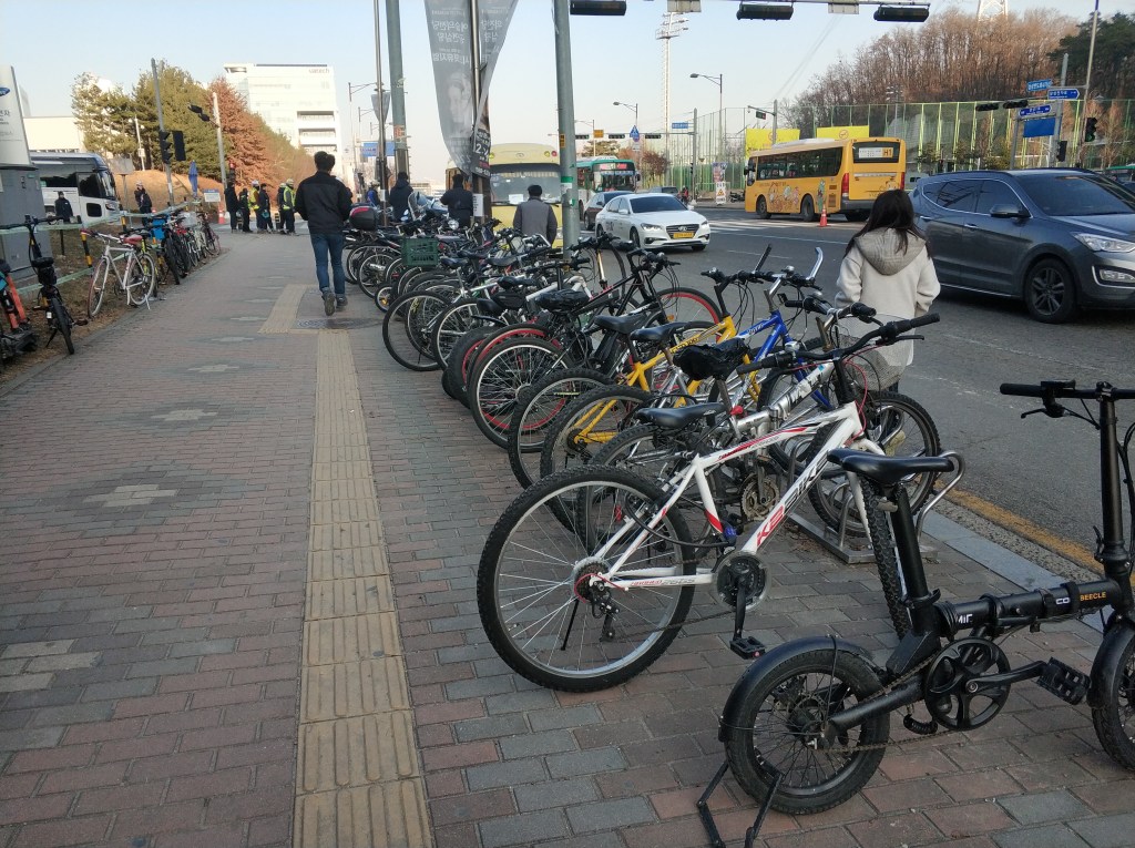 מה שהופך את העובדה שאני רבע שעה מהעבודה *אם אני רוכב לאט* לנפלאה במיוחד בעיני. למעשה, בשלב די מוקדם הבנתי שברוב הבקרים אין בעצם שום סיבה שאני אגיע למשרד המקומי של נובה בבוקר, ואני יכול להגיע ישר למפעל. לרוב אני רוכב לשער הרחוק יותר ממני, שהתנועה בו דלילה יותר והכניסה מהירה יותר, אבל בבקרים המעטים שגשומים או מושלגים (כלומר, חשד למושלגים, שלג אמיתי טרם ירד פה) אני לוקח את נעלי ההרים שלי ומטריה, ופשוט הולך קצת פחות לקילומטר לשער הקרוב אלי, וגיליתי מחדש ש-מה אתם יודעים, גם ללכת זה די נחמד (אם כי, בואו, לחלוטין לא יעיל). אני תוהה מה הפילוח התחבורתי בין העובדים של סמסונג, כי מי שגר במרחק סביר מהמפעל ולא הולך או רוכב את המרחק הזה הוא די פראייר בעיני. יש לציין לטובה שיש אוטובוס ישיר לחלוטין בין מרכז סיאול לדוגנטאן, שהתחנה הראשונה שלו היא מול המפעל (וכבר ניצלתי כמה פעמים בכיוון ההפוך).
