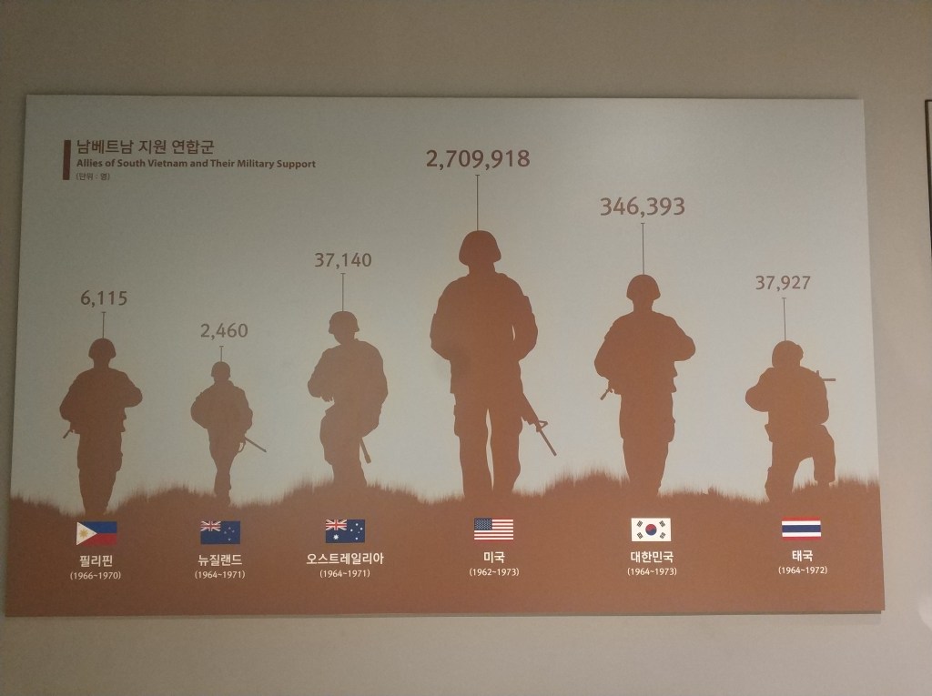 וחשוב להדגיש – זו לא היתה מעורבות זניחה. למעלה מ -300,000 חיילים דרום קוריאנים שירתו בויאטנם במהלך המלחמה, כאשר לאורך רוב מלחמת ויאטנם, הכוח הדרום קוריאני היה שני בגודלו רק לכוח האמריקאי מבחינת כוחות זרים, ולקראת סופה (כשהאמריקאים התחילו להסיג כוחות) אפילו גדול יותר (37,000 ד'-קוריאנים למול 24,000 אמריקאים). כ5,000 חיילים ד'- קוריאנים נהרגו במהלך המלחמה, ועוד כ10,000 נפצעו. כאמור, מעורבות משמעותית ועמוקה.
