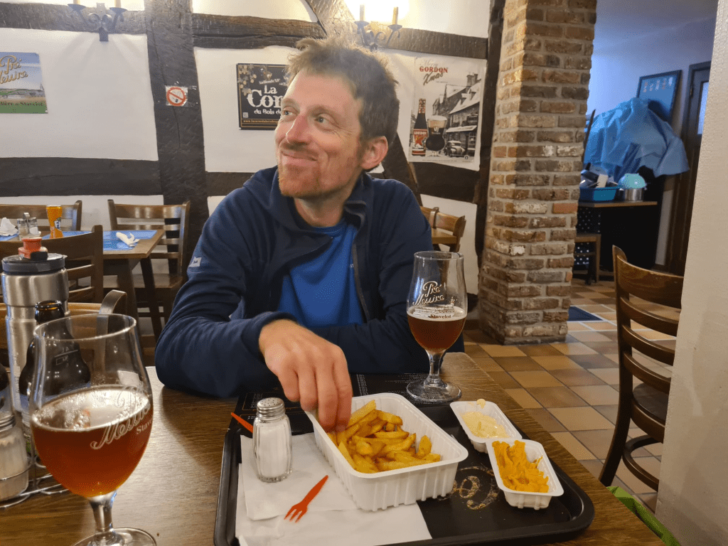 I spent my first round in Belgium in its east, where there are many hills, the fields are green, the fries are excellent and the weather in general is very indecisive but tends to be sullen. There, as mentioned, I rode with Joana, a friend from Ecotopia, and together we battled the deadly combination of rain, steep climbs and too many fries in the stomach (fries are Belgian in origin, not French, as any Belgian will bother to point out if you say the words "French fries". It's the American soldiers in World War II who are responsible for this confusion).