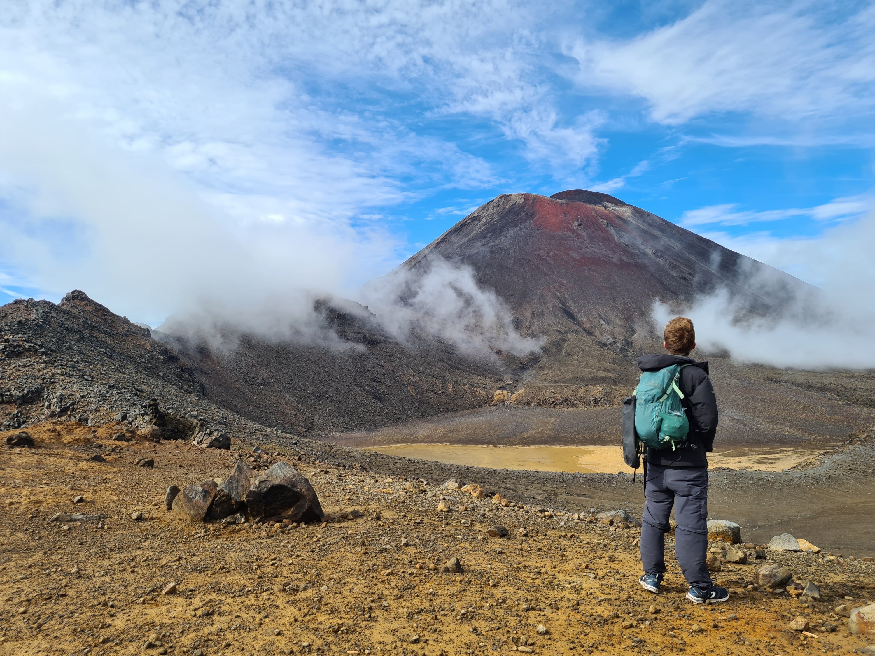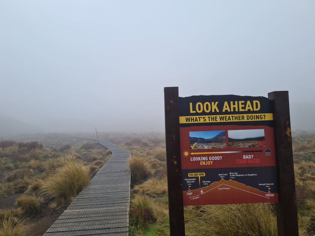 משם רכבתי לעיירה שנקראת National Park (כן, העיירה נקראת National Park, לא מבלבל בכלל) כדי לצאת לטונגרירו אלפין קרוסינג, אחד הטרקים המפורסמים של האי הצפוני, והסיבה שעצרתי בטימבר טרייל סנטר לכמה ימים, כדי לחכות למזג אוויר טוב יותר. ו… קיבלתי מזג אויר ששיתף פעולה באופן חלקי. את הבוקר העברתי בהליכה בערפל, שכן התפזר ברובו כשהגעתי לפאס עצמו. אז זה לא שלא ראיתי את הנוף בכלל, אבל לאור העובדה שכל הימים הבאים היו ימי שמש יפים, כחולי שמיים ונטולי עבים, היתה איזו הרגשה חמוצה של תזמון לא מוצלח. חיכיתי ארבע ימים נוספים כדי לתת למזג האויר להשתפר, בדקתי תחזיות כדי לתזמן נכון, ובסוף דברים לא בדיוק הסתדרו. מה גם שהגעתי לטרק הלא קצר הזה אחרי שינה לא מאוד טובה, ויחד עם העובדה שהרגליים שלי מאוד מוכנות לרכיבה, אבל פחות לטרק רגלי של 20 ק"מ, סיימתי את היום גמור ומדדה, ובמצב רוח בינוני. כן קיבלתי פיצוי מסוים בשקיעה מהממת על מאונט דום ( אה, כן, זה ההר שפיטר ג'קסון ליהק בתור מאונט דום בשר הטבעות),