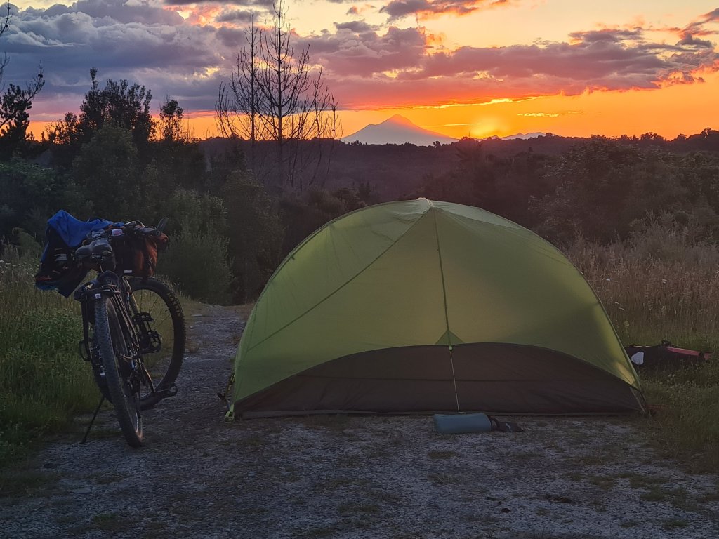בסוף אותו יום מצאתי נקודת חנייה מופלאה עם נוף מפתיע לטאראנקי, הר הגעש שהוא היעד הסופי שלי. עשיתי מקלחת שדה, ושתיתי תה לאור שקיעה, והייתי מרוצה מאוד.