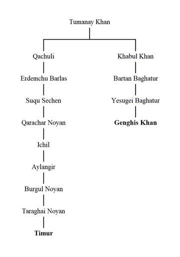 אלא שבתחילת הדרך לפחות, האימפריה הזו לא יכלה להיקרא האימפריה הטימורית. טימור לאנג אומנם היה מצביא מבריק וחסר רחמים, אבל היתה לו בעיה אחת- הוא לא היה צאצא ישיר של ג'ינגיס חאן (changatai היה אחד הבנים של גי'נגי'ס חאן, ועל שמו נקראה הkhanate), וכמו שאמרנו קודם, במשך המאות שנים שאחרי הכיבוש המונגולי, לגיטימציה מלוכתית יכולה להיות רק לצאצאים ישירים. הוא היה בן של ראש שבט מונגלו-טורקי, שיכל להוכיח לכל היותר קרבה מאוד מאוד רחוקה לג'ינג'יס חאן, וכמובן לא מספיקה בשביל להיות שליט בעצמו.