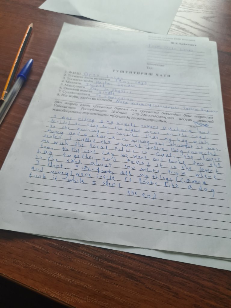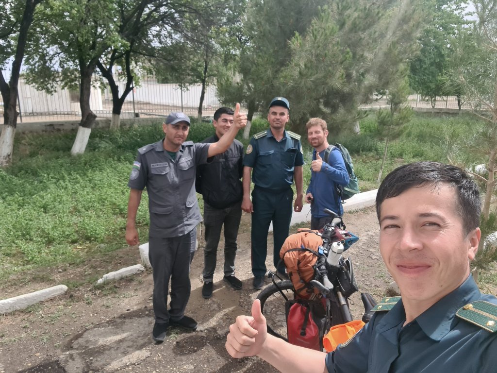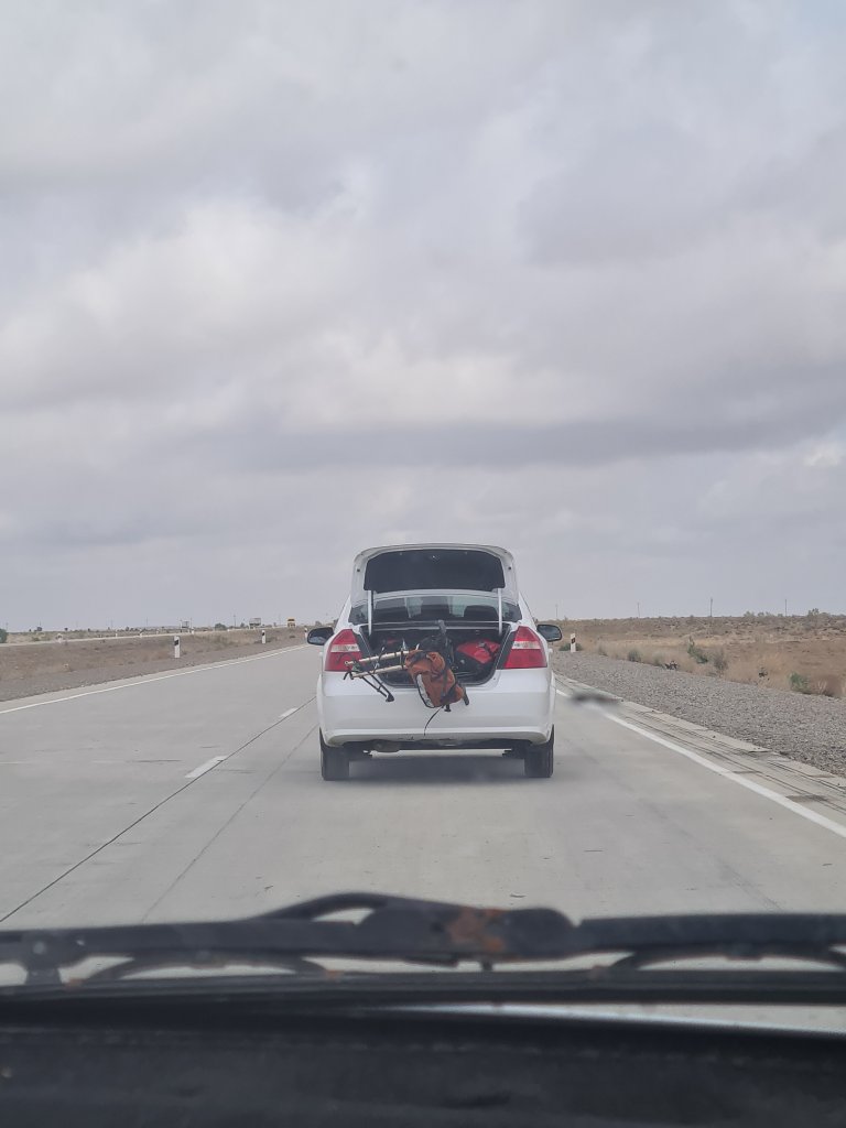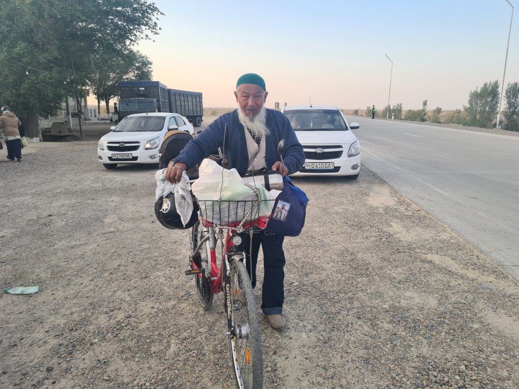 הייתי שמח להישאר שם עוד איזה יום מעבר ליומיים שהייתי שם, אבל בדיוק התגלגלו העירה חבורה של רוכבים אירופיים (זוג גרמני ושני צרפתים), שנראו כמו חברה טובה לחצות איתה 500 קילומטר של מדבר, מה שנותר לי בין חיוה ליעד הבא – בוכרה. למעשה, יצאתי חצי יום לפניהם, כי ידעתי שלא רכבתי עכשיו במשך כמעט חודש, והברך צריכה זמן להתאקלם שוב, אחרת הפציעה הישנה תחזור, אז רציתי להתחיל לאט ולתת להם להדביק אותי.