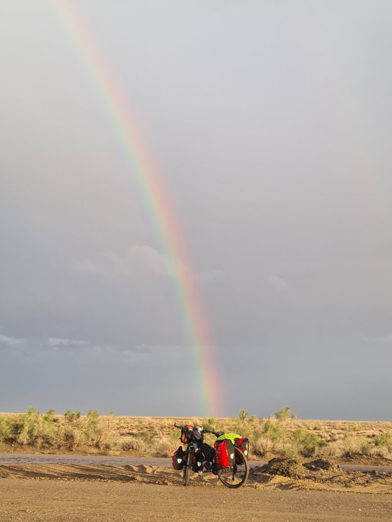 חשבתי שמפה הכל יהיה smooth sailing (למחרת היתה רוח גבית נפלאה), אלא שיומיים אח"כ, בסוף היום, התחיל באופן בלתי צפוי כאב ברור בברך, אם כי מסוג אחר מהרגיל. נאלצתי לעצור מוקדם לאותו יום, חלקתי ארוחת ערב עם חבורה של אוזבקים שעושים עלייה לרגל למכה באופניים, והלכתי לישון מאחורי איזה פונדק דרכים קטן.